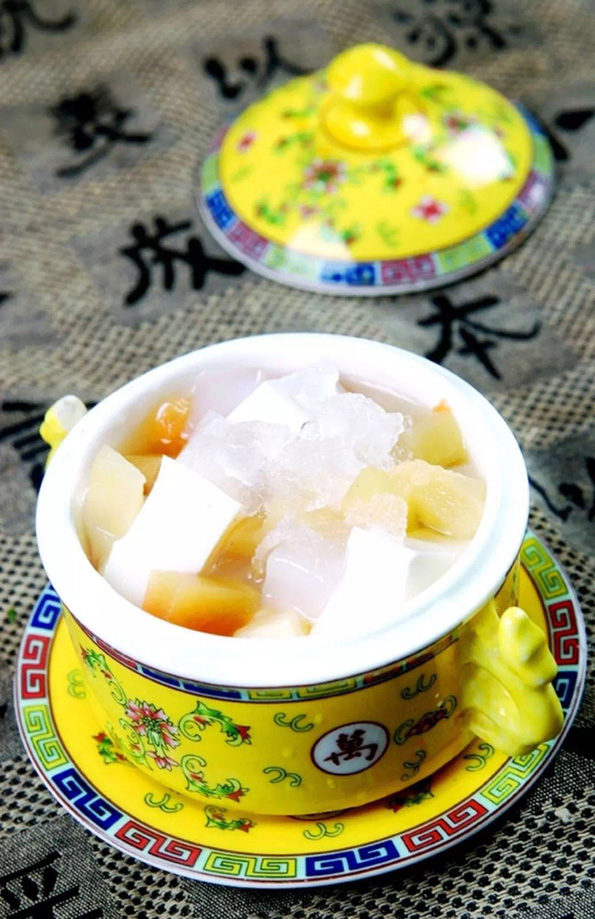 白白的豆腐上面點(diǎn)綴著兩只紅綠櫻桃,很有賣(mài)相,五塊錢(qián)一份。