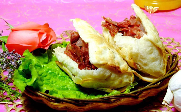 是一種面食,外表看起來(lái)像漢堡包,里面夾著驢肉,外脆內(nèi)軟,濃香撲鼻。