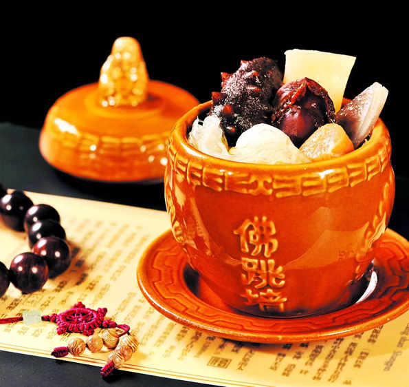 也稱“福壽全”,是用豬肚、雞鴨、羊肉、鴿蛋以及海產(chǎn)品等10多種材料,一起裝進(jìn)紹興酒壇,然后煨制而成。一開(kāi)酒壇,滿室幽香,個(gè)中滋味,回味無(wú)窮。