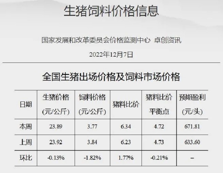 國家發(fā)展和改革委員會(huì)價(jià)格監(jiān)測中心監(jiān)測,2022年12月第1周全國豬料比價(jià)為6.34,環(huán)比上漲1.77%。按目前價(jià)格及成本推算,未來生豬養(yǎng)殖頭均盈利為671.81元。本周國內(nèi)豬價(jià)呈先漲后跌走勢。