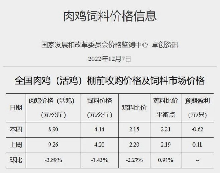 2022年12月第1周全國雞料比價(jià)為2.15,環(huán)比下降2.27%。按目前價(jià)格及成本推算,未來肉雞養(yǎng)殖預(yù)期虧損為0.62元/只。本周終端市場需求減少,屠宰企業(yè)計(jì)劃收購量降低,而周內(nèi)毛雞出欄量相對集中,走貨速度不快,毛雞均價(jià)下跌。下周產(chǎn)品市場表現(xiàn)較為平淡,屠宰企業(yè)計(jì)劃收購量有限,但毛雞出欄量減少,走貨速度大致趨穩(wěn),預(yù)計(jì)毛雞價(jià)格或以穩(wěn)為主。