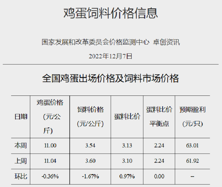 2022年12月第1周全國蛋料比價(jià)為3.13,環(huán)比上漲0.97%。按目前價(jià)格及成本推算,未來蛋雞養(yǎng)殖盈利為每只63.01元。本周多地運(yùn)輸有所恢復(fù),市場流通加快,產(chǎn)區(qū)蛋價(jià)低位上漲,但周均價(jià)環(huán)比略降。短期內(nèi)市場供需或仍處于拉鋸狀態(tài),貨源低價(jià)難收、高價(jià)難銷的局面難有改善,預(yù)計(jì)下周雞蛋價(jià)格或繼續(xù)高位窄幅調(diào)整,蛋雞養(yǎng)殖盈利變化不大。