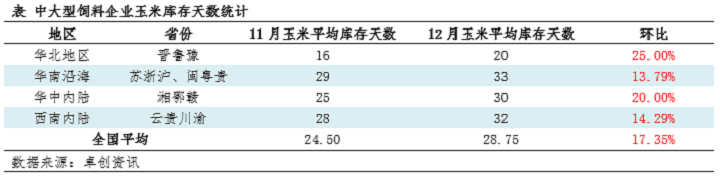 截至12月底,中大型飼料企業(yè)玉米庫(kù)存均有增加,且多數(shù)庫(kù)存在1個(gè)月以上。進(jìn)入1月份,南方飼料企業(yè)備貨基本收尾,以訂單合同為主,高價(jià)現(xiàn)貨簽單意向不高。且生豬價(jià)格持續(xù)低迷,終端養(yǎng)殖利潤(rùn)在盈虧線浮沉,春節(jié)前銷區(qū)玉米購(gòu)銷偏淡,玉米價(jià)格實(shí)質(zhì)性上行空間或偏窄。