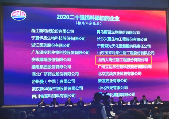 山西大禹生物工程股份有限公司獲評“2020二十強(qiáng)飼料添加劑企業(yè)”榮譽(yù)稱號,并受到農(nóng)業(yè)農(nóng)村部領(lǐng)導(dǎo)高度評價(jià)。