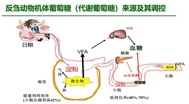 反芻動(dòng)物70%-80%的能量來源于揮發(fā)性脂肪酸(VFA),飼料中的碳水化合物如淀粉、果膠、果聚糖、可溶性糖、纖維素、半纖維素和木質(zhì)素,在瘤胃中被微生物降解產(chǎn)生能量、氣體(甲烷、二氧化碳)、熱量和酸。乙酸、丙酸和丁酸均屬于揮發(fā)性脂肪酸,它們構(gòu)成了瘤胃中產(chǎn)生的絕大部分酸(95%)。大部分丙酸在肝臟中被轉(zhuǎn)化成葡萄糖。另一方面,過瘤胃淀粉經(jīng)過淀粉酶的分解產(chǎn)生葡萄糖,通過小腸吸收進(jìn)入血液。